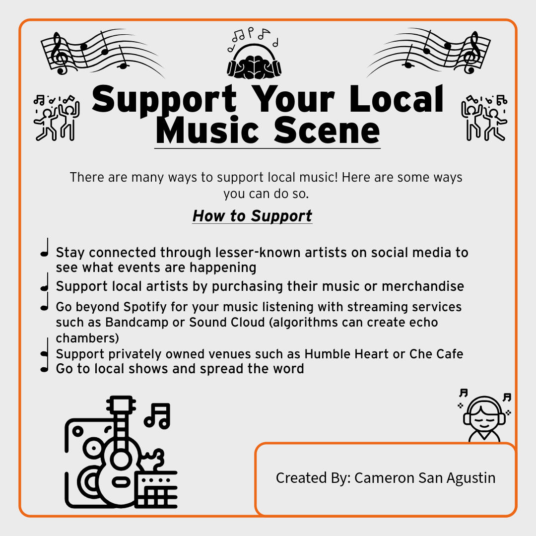 There are multiple ways the community can support the local scene by connecting and staying up to date with local artists, or buying merchandise to support their art. Instead of Spotify, one can try finding music through record stores or online platforms like Bandcamp where you can have the option to send donations to artists.